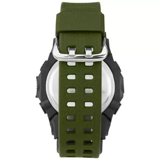 Sua pulseira em silicone texturizado verde garante conforto e resistência, enquanto o mostrador digital com fundo cinza oferece alta legibilidade e diversas funções essenciais: alarme, cronômetro, calendário completo, formato 12/24h e iluminação noturna. O destaque fica por conta dos detalhes em amarelo ouro que trazem mais atitude ao design.